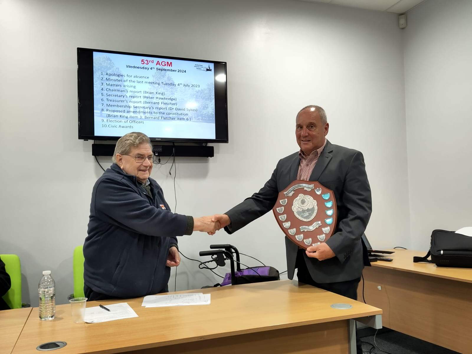 At the recent Rotherham District Civic Society AGM the Chairman presented the Sheila Cameron Shield to David Wadkin the Organiser of the "Discovering Rotherham" initiative for his outstanding serive to the Charity. This includes the Guided Walks which are to continue throughout 2025.